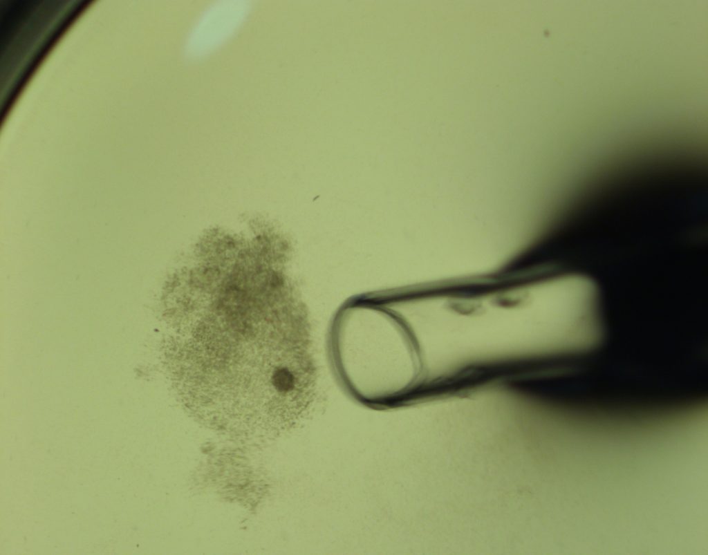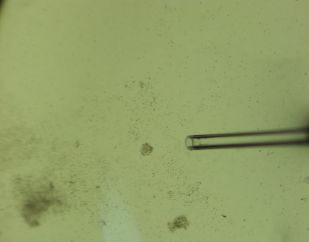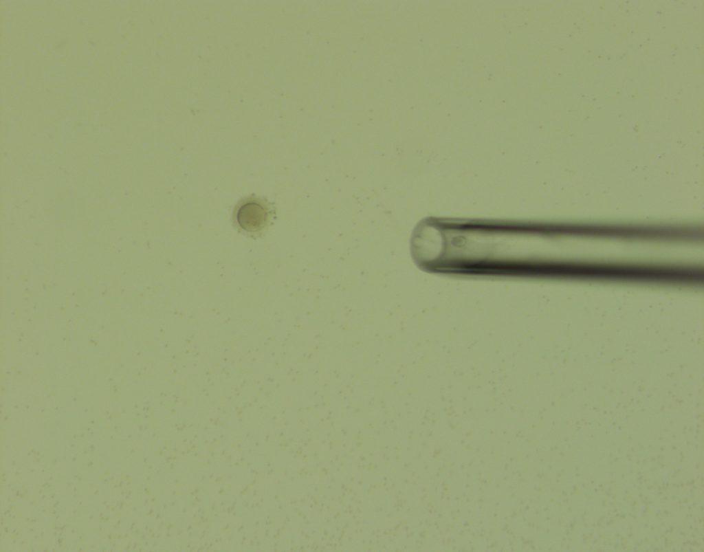 綺麗なつるんとした卵子になっても、この倍率では成熟具合がわからないため、顕微鏡下で拡大して確認を行います。